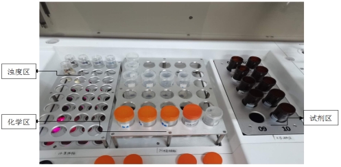 待测区域包括样品架和试剂架,样品架1(浊度检测)和样品2(电极+ 化学检测)分别可放置32 个和30 个样品。试剂架可以摆放10 种不同的试剂。