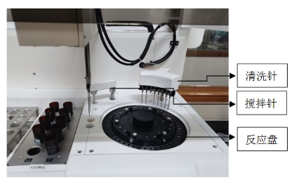 包括电极、浊度计、光度计、反应盘,搅拌臂和清洗塔。反应盘用于比色反应,有48 个反应位,内含加热单元,能够对试剂和样品的混合物进行恒温加热。清洗塔可自动清洗反应杯。